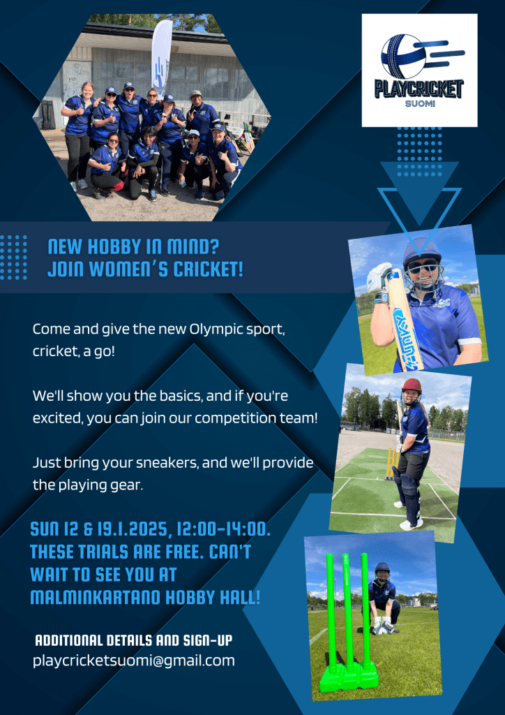 PlayCricket Suomi (est. in 2020) is a cricket club dedicated to junior and women’s cricket. Cricket is played all over the world and there are many formats so everyone can enjoy it. For example, indoor cricket makes it possible to play this classic summer sport during winter. Start a fun cricket hobby by contacting us! For starters, sports clothes and shoes as well as a water bottle are all you need – we provide the cricket equipment!